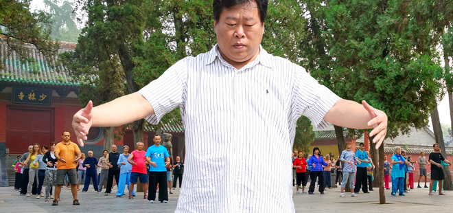 Note, morning practice takes place at the gates of Shaolin Monastery.